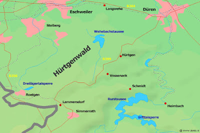 The Hürtgen forest (also: Huertgen Forest; German: Hürtgenwald) is located along the border between Belgium and Germany in the southwest corner of the German federal state of North Rhine-Westphalia. Scarcely 50 square miles (130 km2) in area, the forest lies within a triangle outlined by the German towns of Aachen, Monschau, and Düren. The Rur River runs along the eastern edge of the forest.