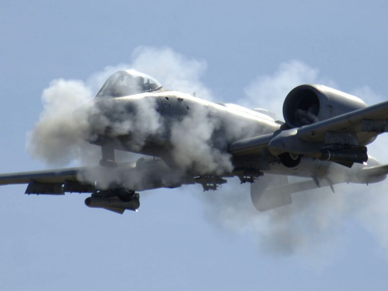An A-10 Thunderbolt II, fires the 30 mm gun at a low angle strafe.